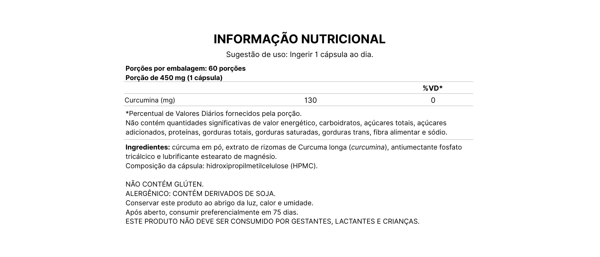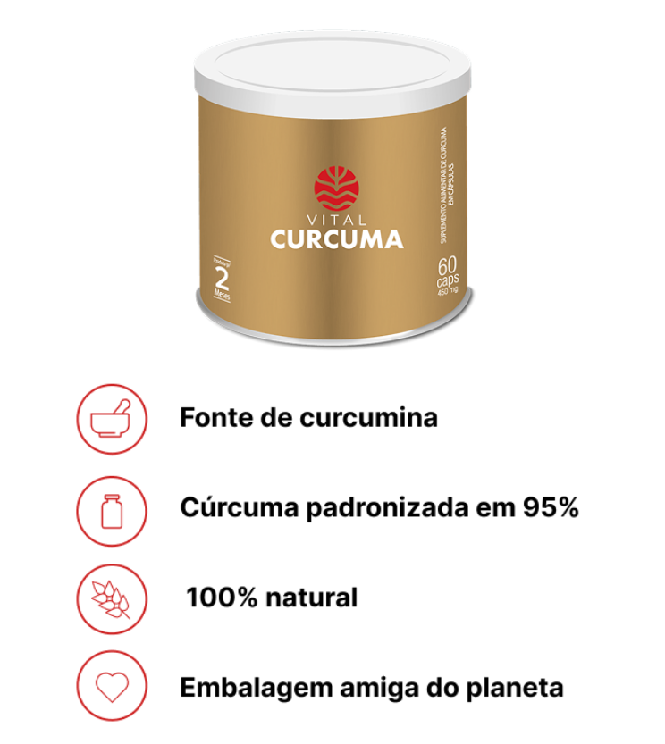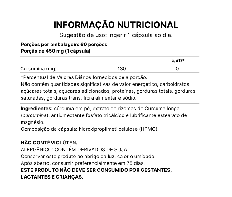 Suplemento alimentar de cúrcuma em cápsulas de 450 mg.