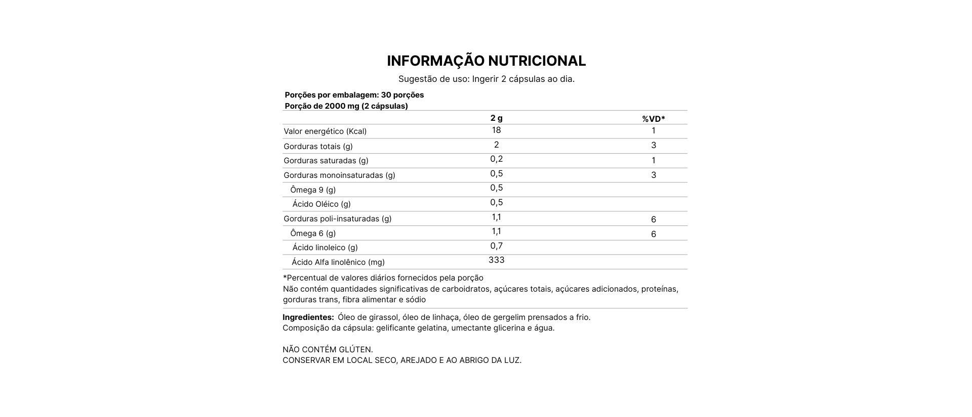 Cada cápsula combina o melhor de ingredientes selecionados, com pureza certificada e procedência garantida, oferecendo um perfil único de ácidos graxos – incluindo ALA (ácido alfa-linolênico), precursor de ômega 3, além de ômega 6 e ômega 9.