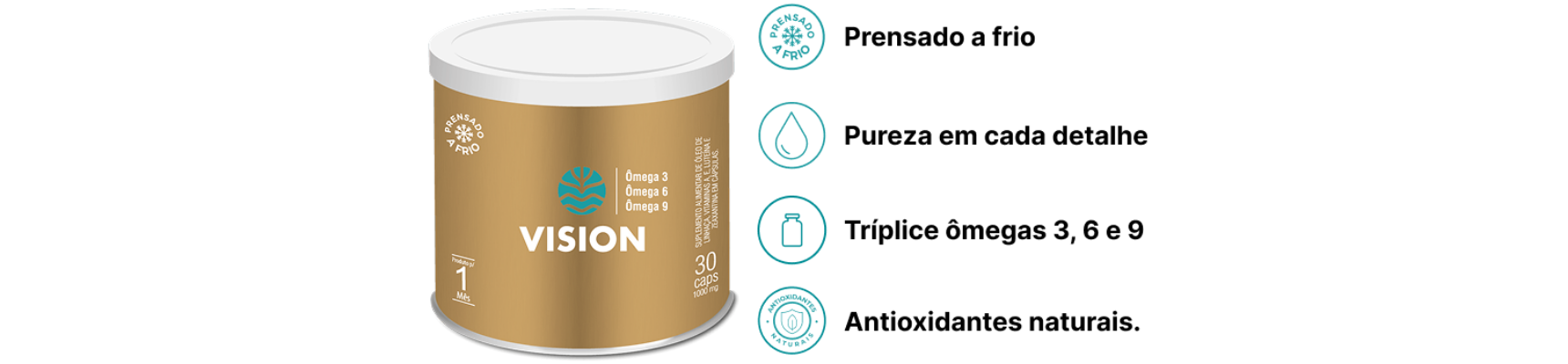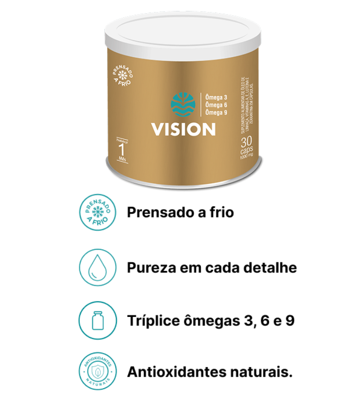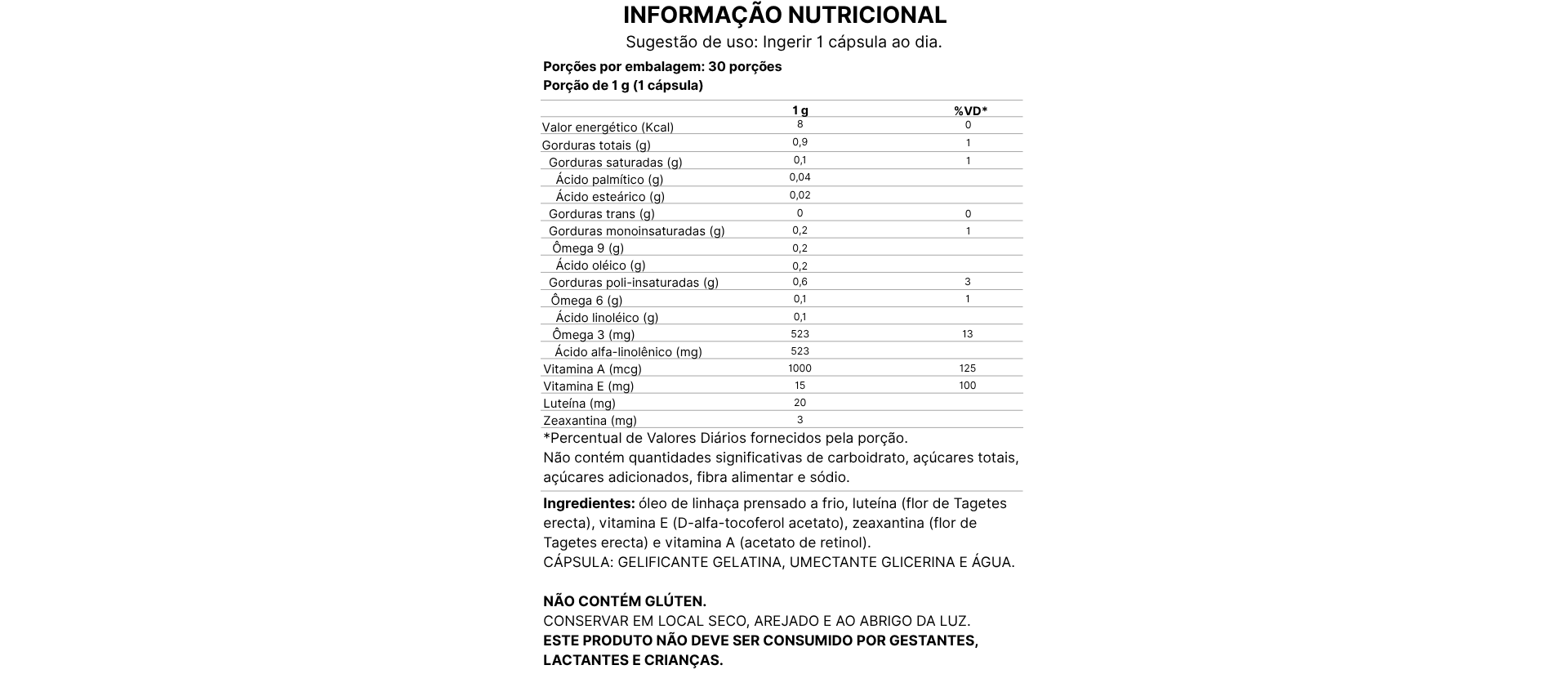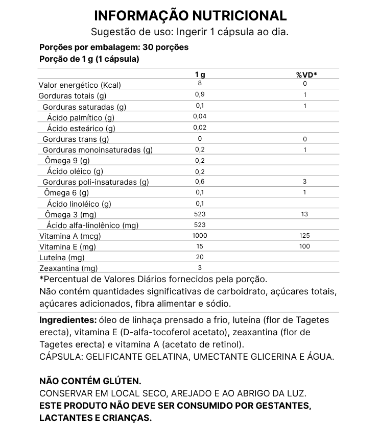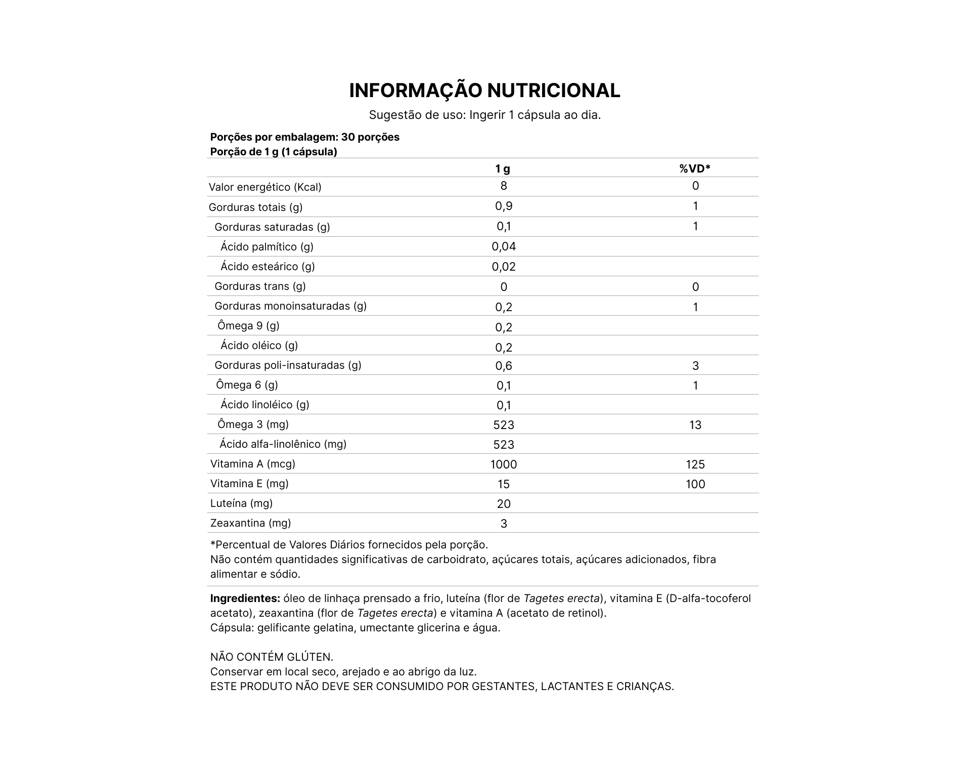 Suplemento alimentar de óleo de linhaça prensado a frio, vitaminas A, E, luteína e zeaxantina em cápsulas de 1.000 mg.