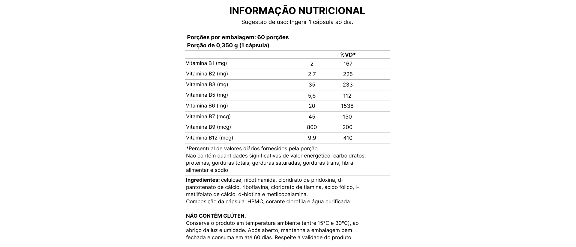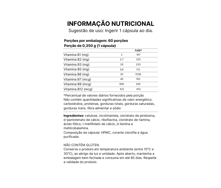 Suplemento alimentar de vitaminas B1, B2, B3, B5, B6, B9 e B12 em cápsulas de 350 mg.