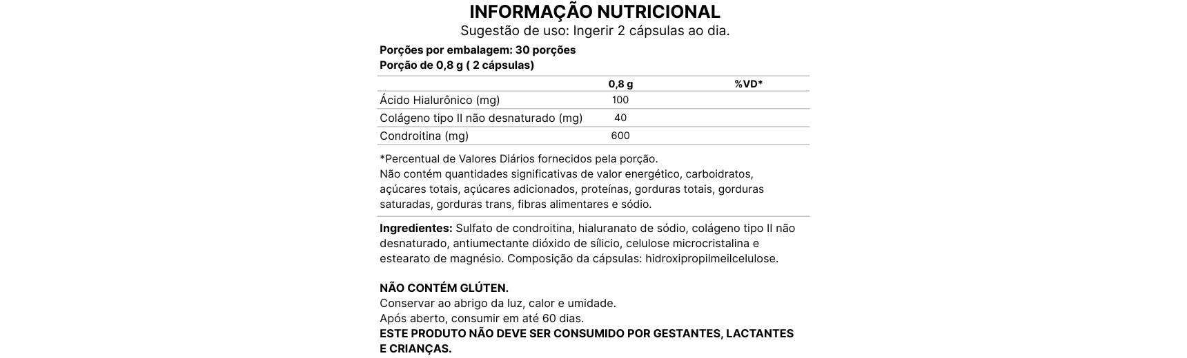 Suplemento alimentar de colágeno tipo II, ácido hialurônico e condroitina em cápsulas e 400 mg.